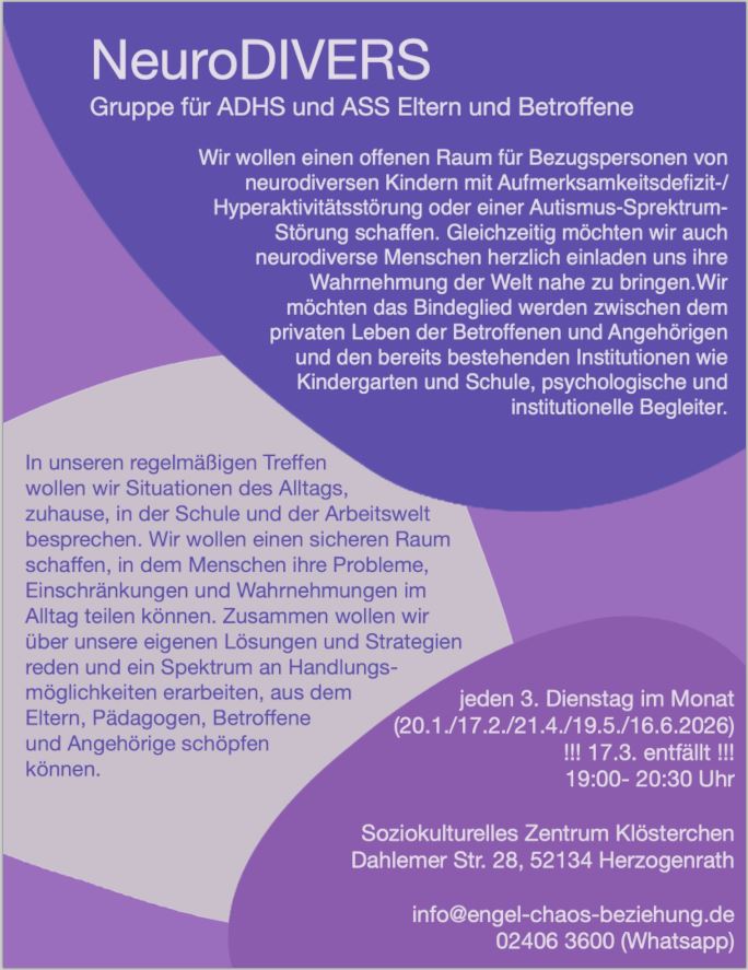 Ob als Elternteil oder selbst betroffen von ADHS oder einer Autismus-Spektrum-Störung? Die neue Selbsthilfegruppe im "Soziokulturelles Zentrum Klösterchen" an der Dahlemer Straße 28 in Herzogenrath bietet ein bewusst breites Spektrum und einen ebensolchen Austauschrahmen an, um miteinander ins Gespräch zu kommen. Trotz aller Spezifika der unterschiedlichen Erscheinungsformen, soll der Einstieg dieser offenen Gruppe an jedem 3. Dienstag im Monat von 19-20:30 Uhr zunächst die Vielfalt in den Blick nehmen, um dann dem Prinzip der Selbsthilfe nach gemeinsam zu entscheiden, welche Differenzierungen im Diskurs notwendig sind. So schaffen wir miteinander und selbstbestimmt einen sicheren Raum für Austausch, Verständnis und gemeinsame Strategien für den Alltag. Auch BetreuerInnen, IntegrationshelferInnen, LehrerInnen und ErzieherInnen sind herzlich willkommen. Kontakt und weitere Infos über Renate Engel unter r.engel@arbeit-umwelt-kultur.de oder Tel.: 02406/3600 (auch via WhatsApp).